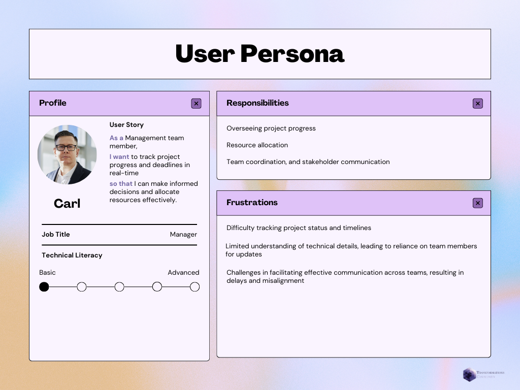 Three personas developed to represent members of different teams within the Transformations Community staff.
